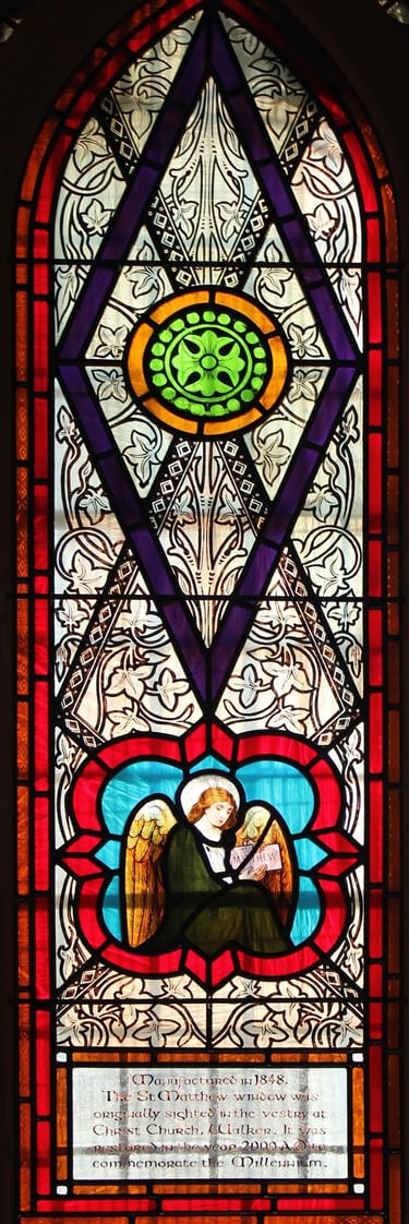 Inscription - Manufactured in 1848. The St Matthew window was originally sited in the vestry at Christ Church Walker. It was restored in the Year 2000 AD to commemorate the Millennium.