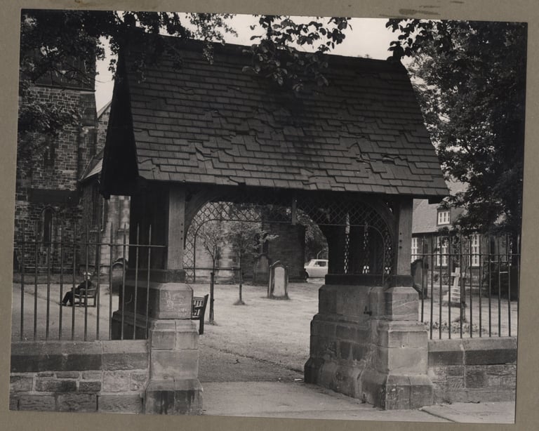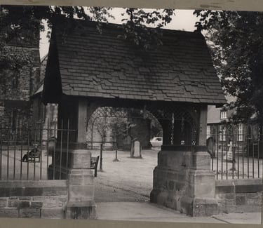 The Lych gate in the 1960's with the old church hall building in the background.