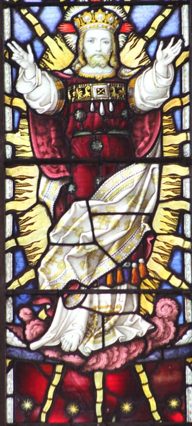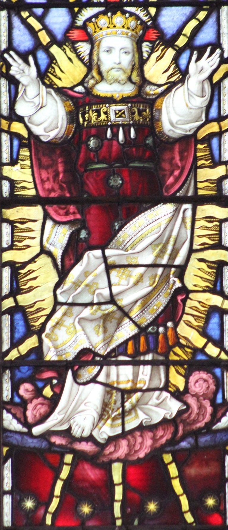 The central figure wearing a crown is of Christ in Majesty. [The Church is also called 'Christ Church' so it is appropriate that this window should be about Christ the King.]