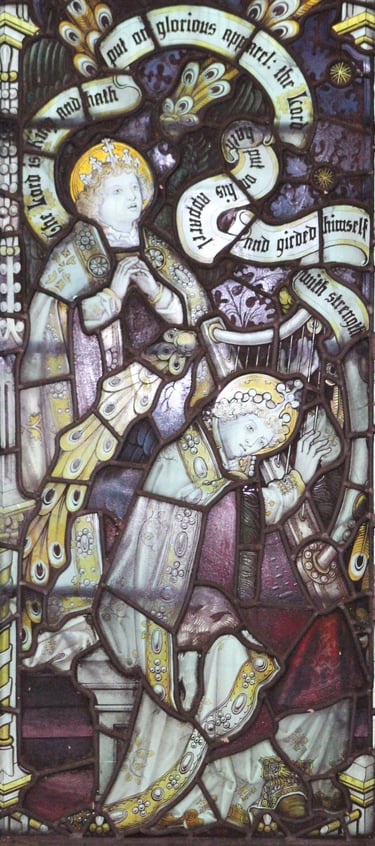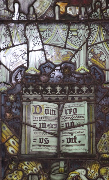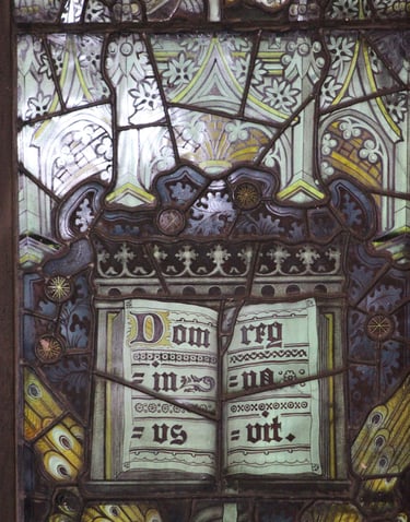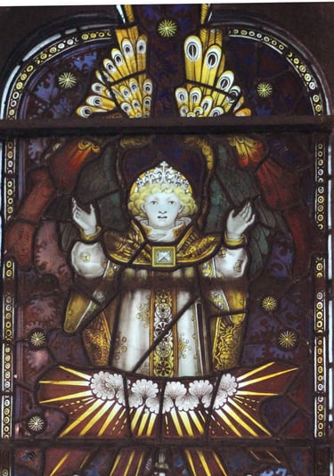 The first recorded window of Kempe's was the Bishop Hooper Memorial Window in Gloucester Cathedral made in 1865 at Clayton and Bell's studio. In 1866 Kempe started work on his own in London and as an authority on mediaeval stained glass he became involved in many resoration projects. His business continued to expand but at all times the quality of the work was maintained. As well as stained glass, the studio also designed church furniture, screens, altars etc and Kempe himself, designed vestmants and altar frontals which were then embroidered by an order of Sisters.