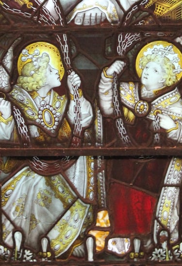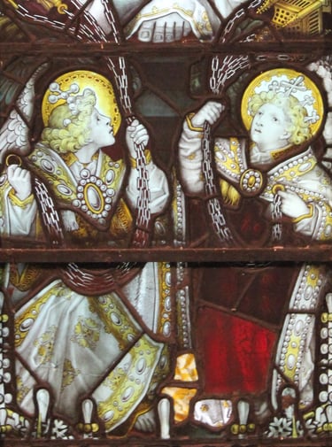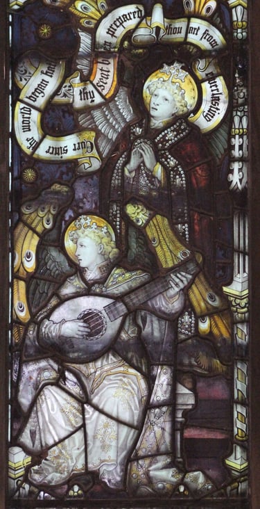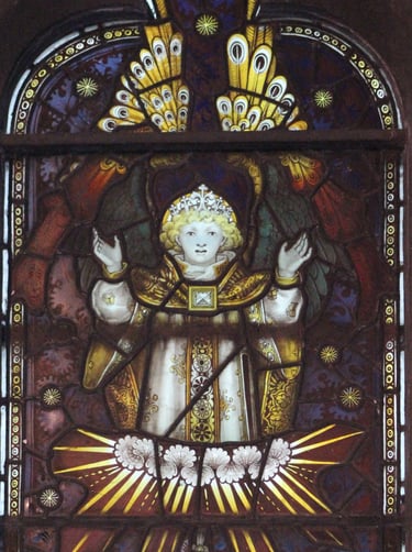 There are some known examples of Kempe's work in this area, one from 1877 at St Mungo's Church, Simonburn, Northumberland and another from the 1902 - 1906 period at St Hilda's Church, Whitby as well as several examples in Newcastle Cathedral, most of which are too high to see, but there is a rarity in St Margaret's Chapel, next to the bookshop. Here the 1896 window depicts Saints Hilda, Helen, Ethelburga and the Holy Women at The Tomb. This window not only has the early logo of Kempe's of three wheatsheaves in a shield but also, in the opposite corner, it has the initials AET - for Arthur Tombleson who was Kempe's principal glass painter and the only person Kempe ever allowed to be personally recognised. Considering our parish links with the diocese it seem appropriate that Winchester Cathedral also has some Kempe glass which dates from 1897 - 1900.