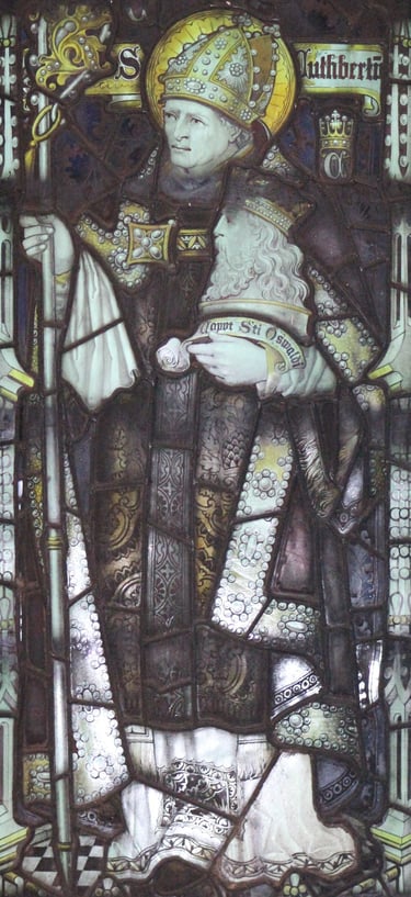 St Cuthbert carrying the head of St Oswald probably being responsible for the care of the Saint’s relics. (St Cuthbert was a Northumbrian who died on the Farne Islands AD687 and is buried at Durham Cathedral.)