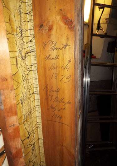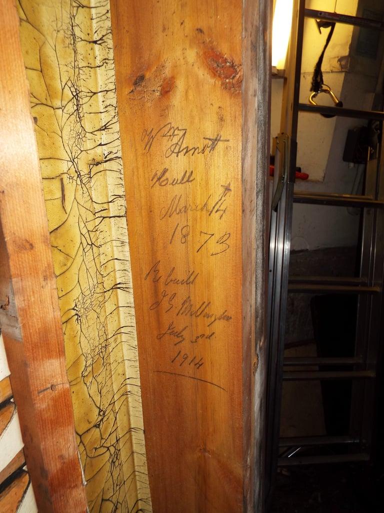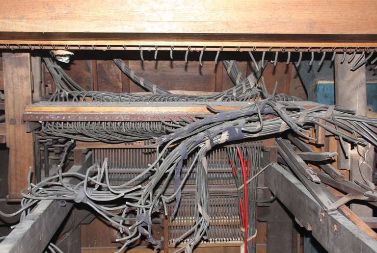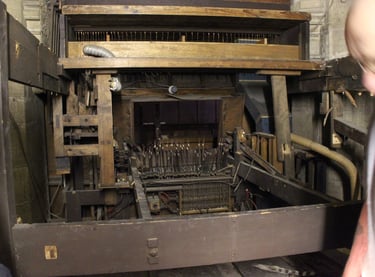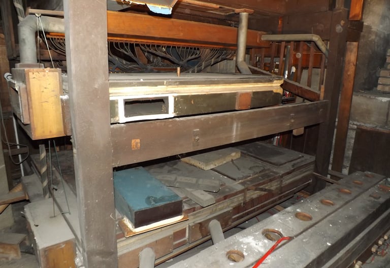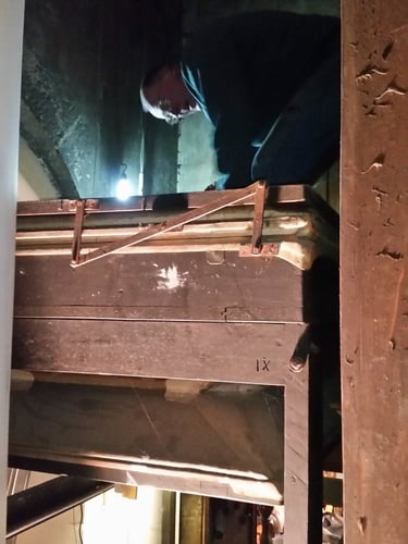 The air power for the organ was provided by two sets of bellows (upper and lower). This picture shows the removal of the upper bellows