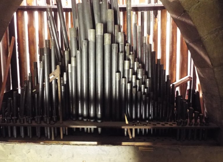 Some of the last remaining pipes, looking out from behind the ornate pipe-work that still remains in place above the organ.